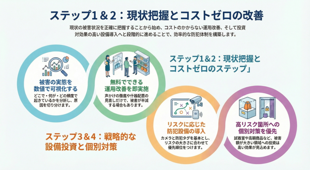 これらは費用をかけずに始められ、即日から効果が期待できます。その後、余裕が出た段階で防犯タグや自鳴タグなどの設備投資を検討しましょう。