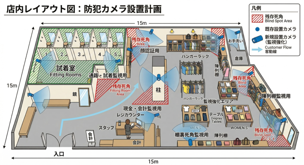 ・ 防犯カメラ|出入口・試着室前・高額商品棚・バックヤードが基本