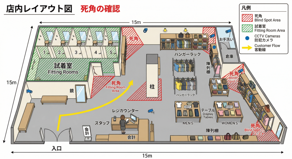 アパレル店舗では、試着室、什器による死角、接客中の目配り不足、セール時の混雑など、万引きが起こりやすい条件が重なりやすい。