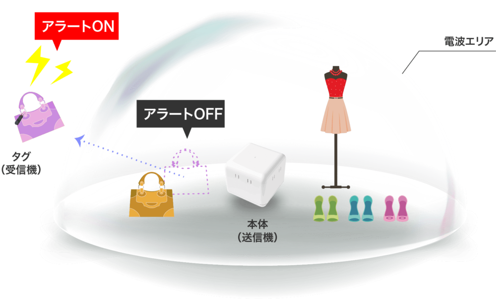 警戒エリア内で専用自鳴式タグを取り付けご利用ください。
