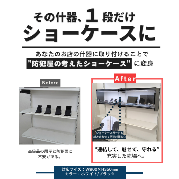 既存のシステム什器に『一段だけショーケース』を取り付けることによって一般的な陳列棚から防犯機能を取りそろえたショーケースに大変身。
